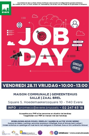 De ‘Job day’ is een evenement dat sinds 2014 om de twee jaar door de partners van het Jobhuis wordt georganiseerd. Het is een jobbeurs waarop ondernemingen worden uitgenodigd om hun vacatures aan werkzoekenden voor te stellen. Tegelijk worden er verschillende workshops georganiseerd onder begeleiding van professionele coaches.